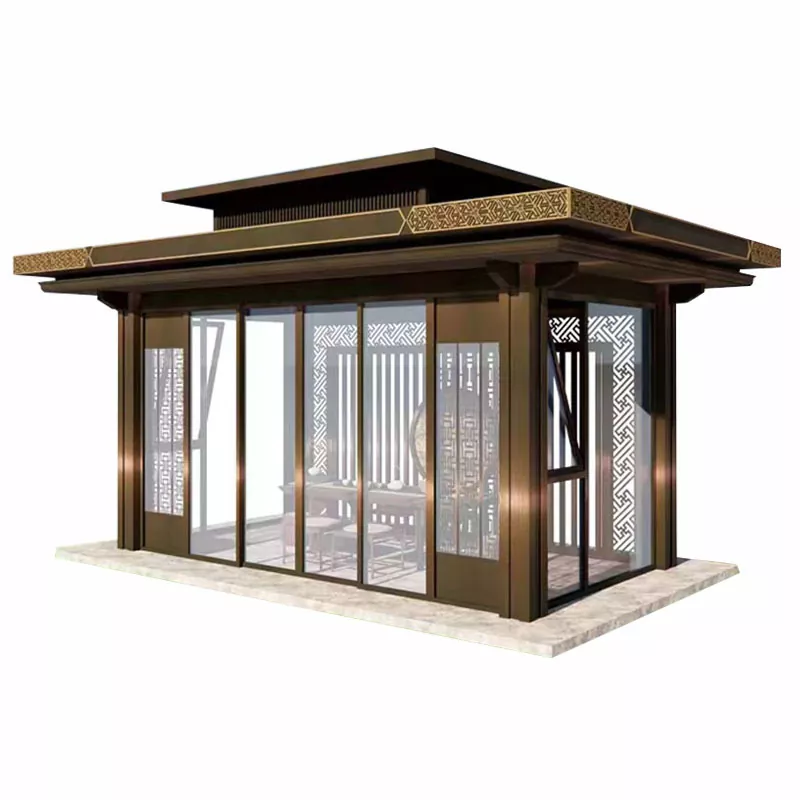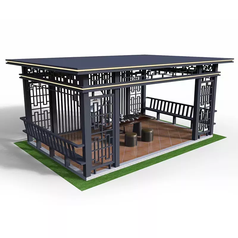 Ancient Architecture Reproduction Pavilion (5000×5000 mm): 120×120 mm fortykkede søyler, brakettstruktur, åpent utskårne hengende gitter, egnet for kulturelle arenaer og kjerneområder med naturskjønne steder.